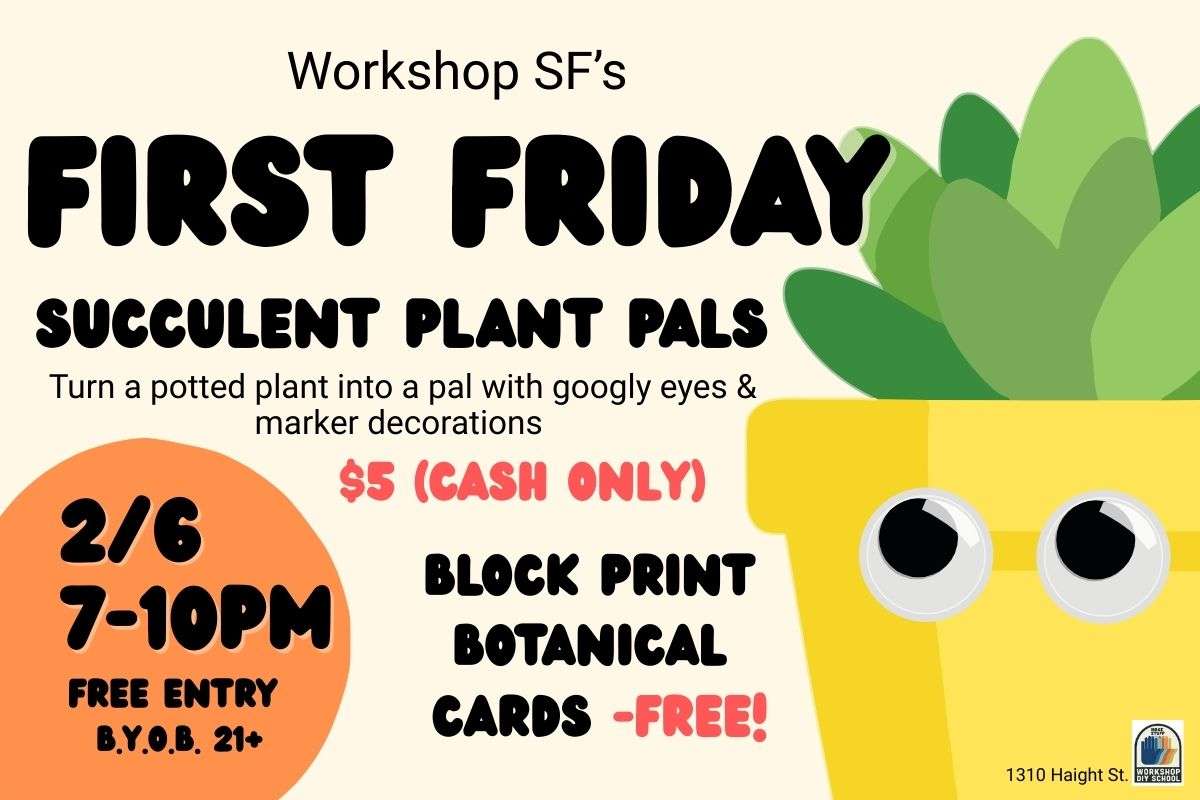 Join us for our February First Friday, where we’ll be making our own plant buddies by decorating a potted succulent with googly eyes and markers ($5) and block printing botanical inspired cards (FREE).